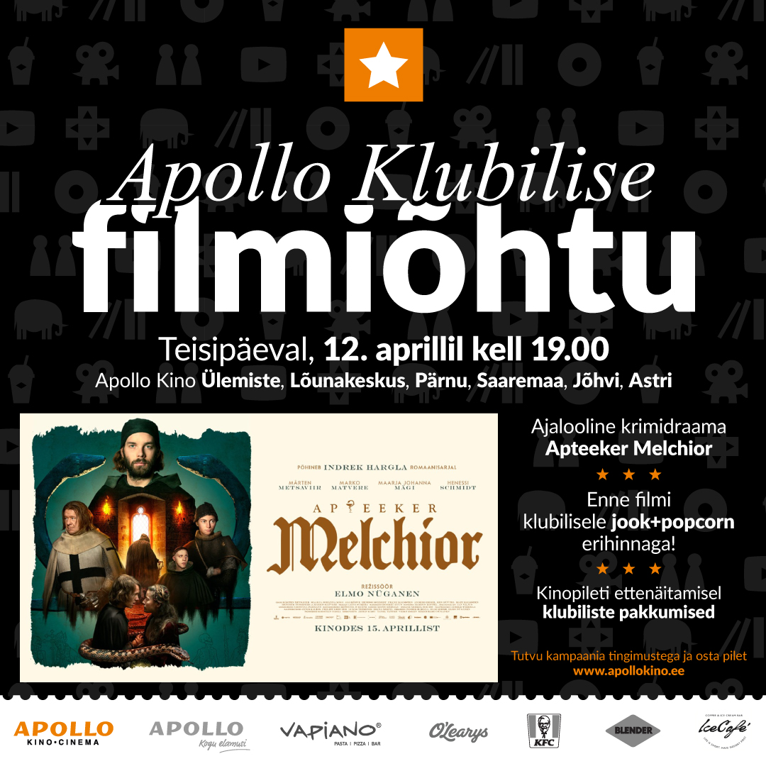 Apollo Klubilise filmiõhtu kutsub 12. aprillil kell 19.00 kõiki Apollo Klubi liikmeid osa saama keskajast inspireeritud mõrvamüsteeriumi “Apteeker Melchior” eellinastusest!
