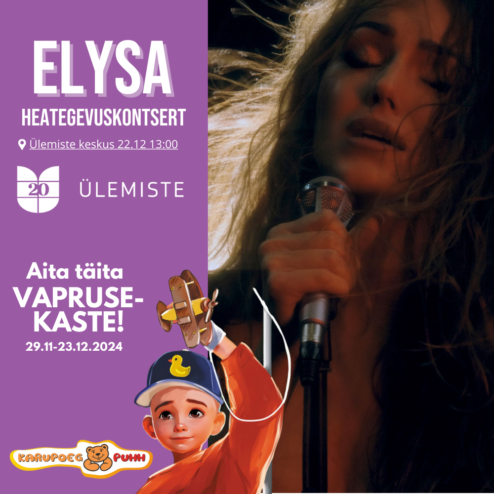 Karupoeg Puhh, Ülemiste keskus, ELYSA ja Anastassia Smotrova kutsuvad sind heategevuskontserdile, mis toimub Ülemiste keskuse 1. korrusel, peasissepääsu juures asuvas aatriumis 22.12 kl 13!