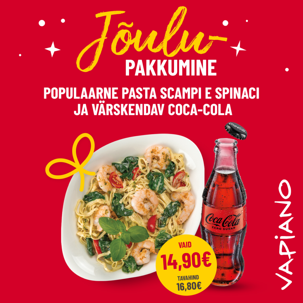 Naudi meie populaarset Pasta Scampi e Spinacit koos värskendava Coca-Cola või Coca-Cola Zeroga – ideaalne pühadekombo! Eripakkumise hind vaid 14,90 € (tavahind 16,80 €).