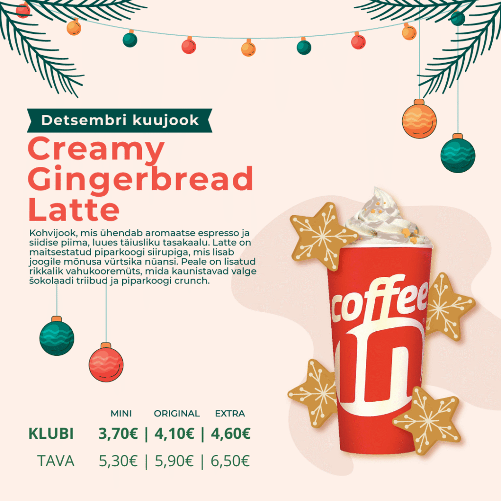Detsembri kuujook Creamy Gingerbread Latte toob tassitäie jõuluhõngu iga päevaga lähemale. Kreemine latte piparkoogi siirupi, vahukoore ning valge šokolaadi ja piparkoogipuru kattega on nagu väike maius külmal hommikul.