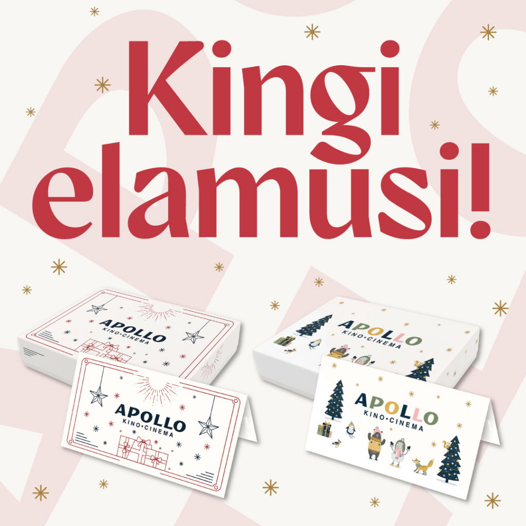 Kui detsember teeb õhtud pimedaks ja õhu krõbedaks, siis kinos läheb vastupidi: ekraanil on rohkem sära, rohkem seiklusi ja rohkem tundeid. Kinkepileti kompelkt (2x Apollo Kino kinkepiletit) 17€ ApolloStar kinkepileti komplekt (2x Apollo Kino staaritooli kinkepiletit) 30€ Laste kinkepileti komplekt (2x Apollo Kino laste kinkepiletit) 10€ Kinkekarbi komplekt (1x Apollo Kino kinkepiletit, 1x keskmise popkorni ja 1x keskmise joogi voucher) 18,99€ Laste kinkekarbi komplekt (1x Apollo Kino laste kinkepilet, 1x väikse popkorni ja 1x väikse joogi voucher) 13,99€ Kinkekomplektid on müügis kinos kohapeal ning ka veebis. www.apollokino.ee