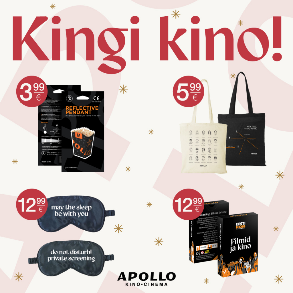 Kui tahad kinoelamust ka endaga kaasa võtta või otsid väikest, aga ägedat kingiideed, siis piilu meie meenete valikut, kus on: Popkorni helkur – helkur Apollo Kino popkornikarbi kujul, karabiinkinnitusega Kandekotid – valikus must kandekott tekstiga “Kõik teed viivad kinno” ning hele kandekott filmitegelaste illustratsioonidega Unemask – komplektis kaks erineva sõnumiga unemaski ja mugav väike kotike Eesti mäng. Filmid ja kino – filmimälumäng 55 kaardi ja 108 küsimusega Eesti ning maailma filmiklassika kohta. Kõik meened on saadaval vaid kinodes kohapeal. Kinoelamusteni!