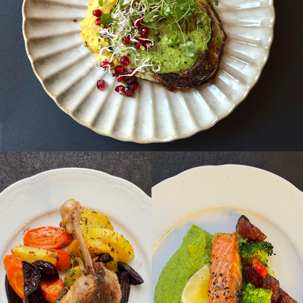 Röstitud kapsas basiilikuvõi ja kaalika-porgandipüreega (N, T) – 8,5€; Punase kala filee rohelise herne püree ja ahjujuurviljadega (N) – 10,5€; Pardi confit röstitud köögiviljade ja punase veini kastmega (N, L) – 10,9€.