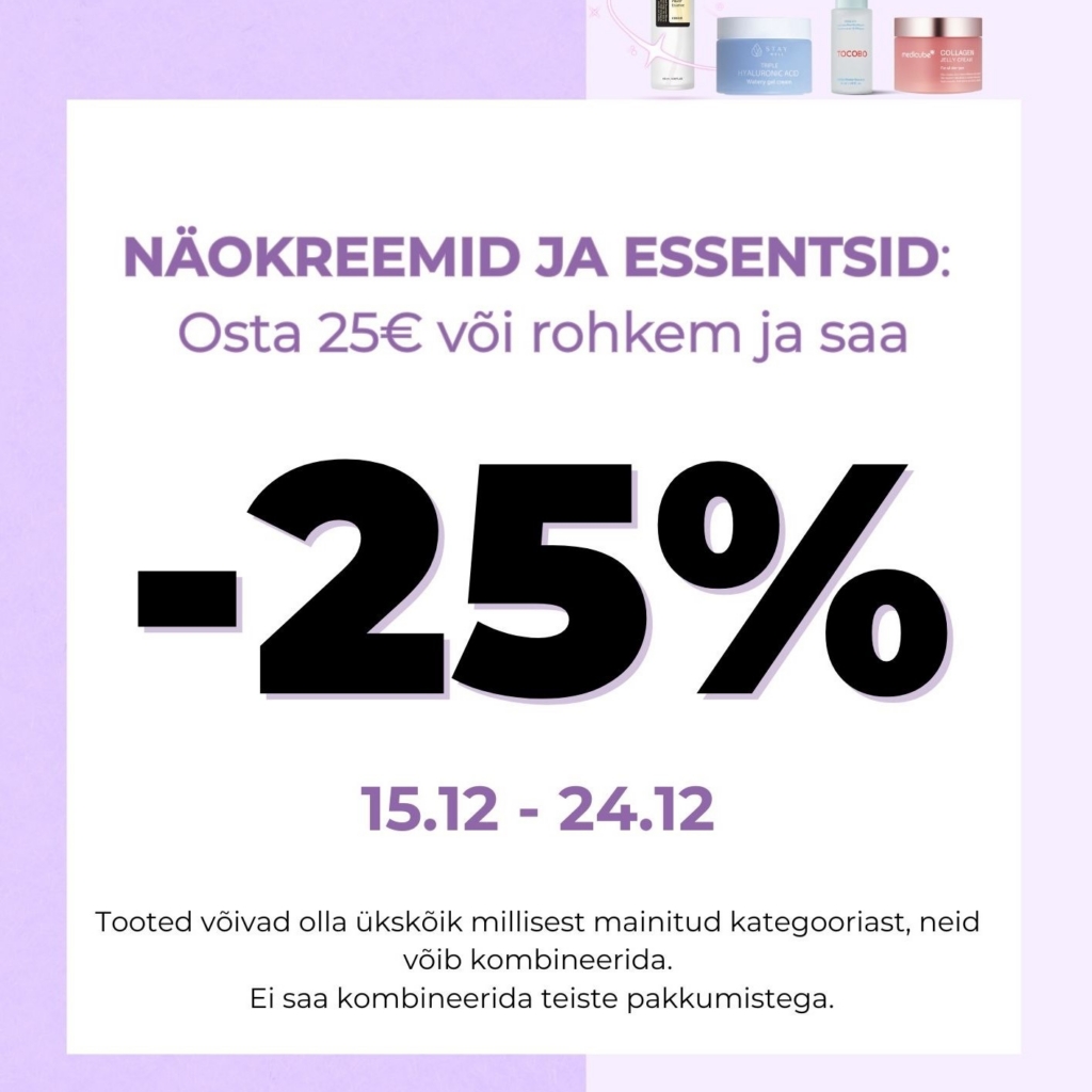 Avasta tõhus nahahooldus ja kingi oma nahale see, mida ta tõeliselt vajab. Kampaania raames kehtib -25% soodustus kõikidele näokreemidele ja essentsidele, kui ostusumma on 25 € või rohkem. See on ideaalne võimalus täiendada oma igapäevast hooldusrutiini, proovida uusi lemmikuid või varuda usaldusväärseid tooteid pikemaks ajaks. Olgu sinu nahk kuiv, tundlik või kombineeritud – kvaliteetne hooldus algab õigetest toodetest.