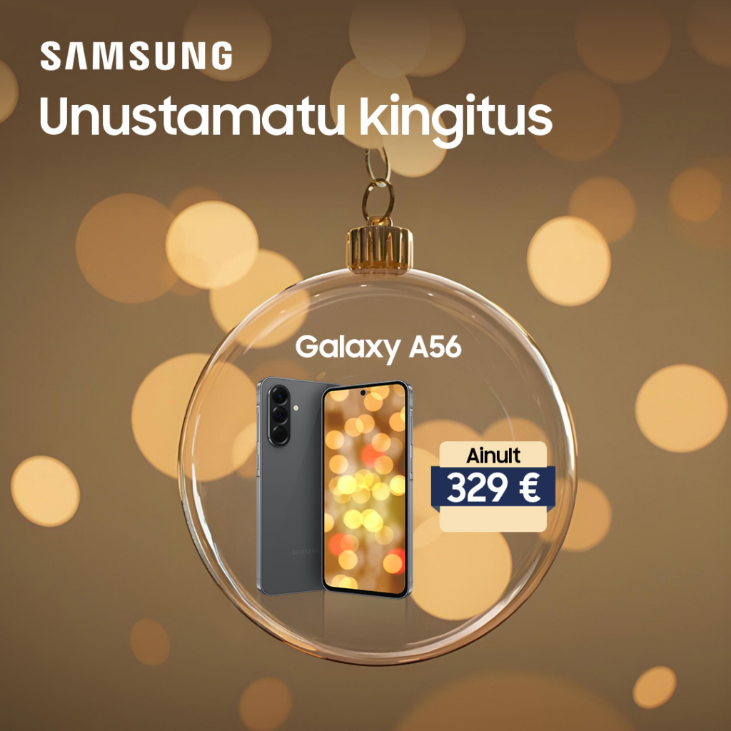 Sel aastal võib kingituste otsimine olla stressivaba – külasta Samsungi poodi, räägi ekspertidega ja vali tehnoloogia, mis rõõmustab tõeliselt nii sind kui ka su lähedasi! Sind ootavad pidulikud pakkumised nutiseadmetele ja JBL-i heliseadmetele! Kogu detsembri jooksul on Galaxy S25 Ultra nutitelefon saadaval vaid 109,9 euro eest kuus, Galaxy A56 vaid 329 euro eest ja Galaxy Watch 7 vaid 179 euro eest! Lisaks on kõik JBL-i audioseadmed 30% allahindlusega! Lõppude lõpuks on pühad lihtsamad, kui parimad valikud on siinsamas käe-jala juures! Ära jäta neid suurepäraseid pakkumisi kasutamata – külasta Samsungi poodi juba täna! Hinnad kehtivad kuni 31.12.2025 Galaxy S25 Ultra Titanium Silverblue 256 GB telefoni ostmisel, Galaxy A56 128 GB telefoni ostmisel ja Galaxy Watch 7 44 mm rohelise nutikella ostmisel. Liising ilma hinnatõusuta kuni 10 kuud. Piiratud kogus saadaval. Lisateabe saamiseks pöörduge poe eksperdi poole.