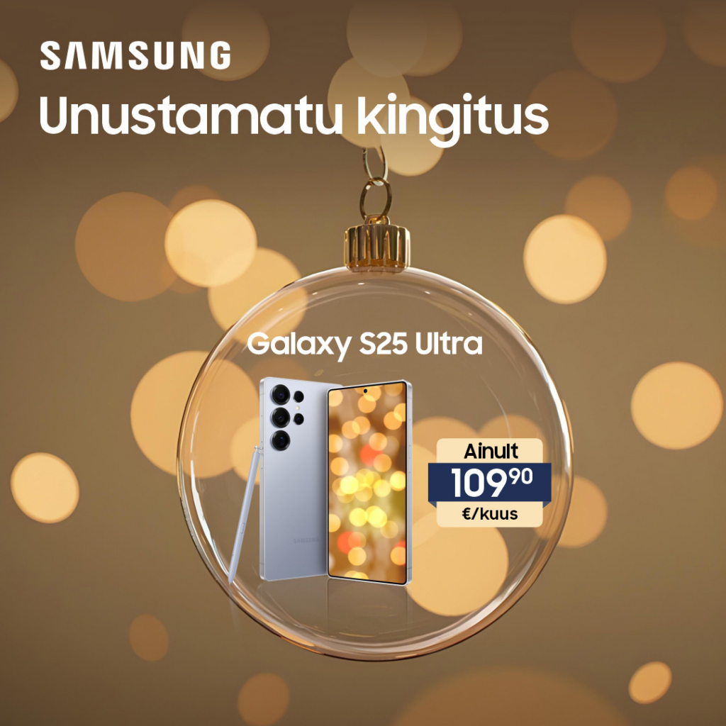Sel aastal võib kingituste otsimine olla stressivaba – külasta Samsungi poodi, räägi ekspertidega ja vali tehnoloogia, mis rõõmustab tõeliselt nii sind kui ka su lähedasi! Sind ootavad pidulikud pakkumised nutiseadmetele ja JBL-i heliseadmetele! Kogu detsembri jooksul on Galaxy S25 Ultra nutitelefon saadaval vaid 109,9 euro eest kuus, Galaxy A56 vaid 329 euro eest ja Galaxy Watch 7 vaid 179 euro eest! Lisaks on kõik JBL-i audioseadmed 30% allahindlusega! Lõppude lõpuks on pühad lihtsamad, kui parimad valikud on siinsamas käe-jala juures! Ära jäta neid suurepäraseid pakkumisi kasutamata – külasta Samsungi poodi juba täna! Hinnad kehtivad kuni 31.12.2025 Galaxy S25 Ultra Titanium Silverblue 256 GB telefoni ostmisel, Galaxy A56 128 GB telefoni ostmisel ja Galaxy Watch 7 44 mm rohelise nutikella ostmisel. Liising ilma hinnatõusuta kuni 10 kuud. Piiratud kogus saadaval. Lisateabe saamiseks pöörduge poe eksperdi poole.