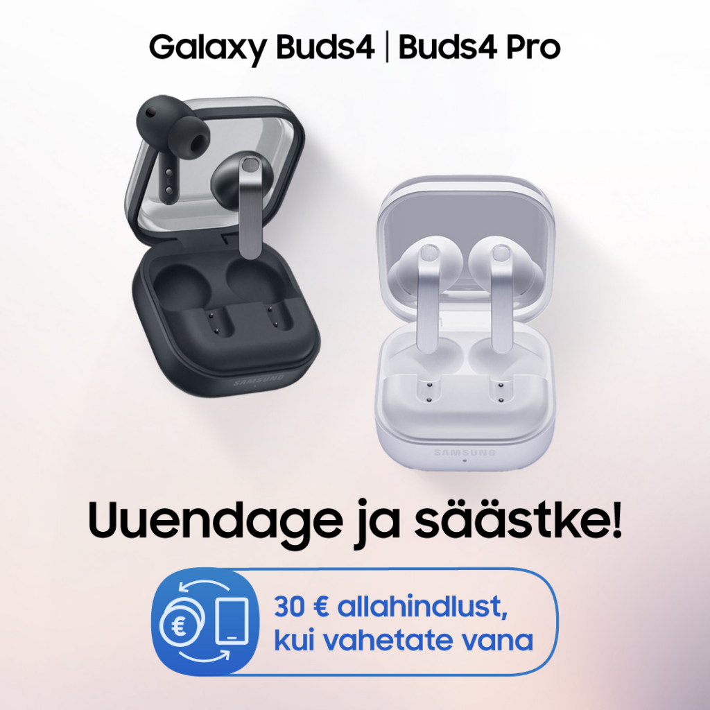 Avasta uue põlvkonna heli Samsung Galaxy Buds4 Pro abil – need pakuvad veelgi paremat helikvaliteeti, tõhusat müra summutamist ja maksimaalset mugavust. Ära jäta kasutamata võimalust proovida uusi juhtmeta kõrvaklappe veelgi soodsamal hinnal: kui vahetad oma vana seadme Samsungi poes uue vastu, saad mitte ainult seadme väärtusel põhineva allahindluse, vaid ka täiendava 30 euro suuruse allahindluse! Pakkumine kehtib kuni 3. maini – ära jäta seda kasutamata! Pakkumine kehtib kuni 03.05.2026, kui toote vana seadme ja ostate Galaxy Buds4 Pro juhtmeta kõrvaklapid. Kogus on piiratud. Lisateabe saamiseks pöörduge poe eksperdi poole. Tagastatava seadme väärtus peab olema vähemalt 10 €.