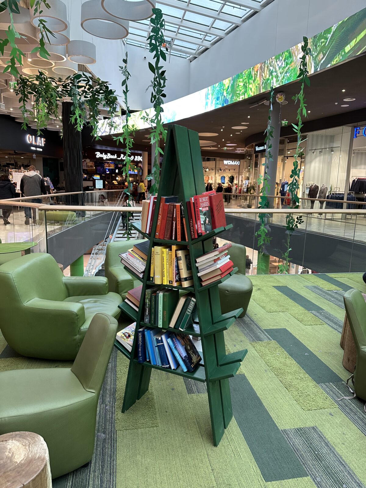 Puukujuline raamaturiiul asub keskuse teisel korrusel, rohelises puhkealas. Riiulile võib raamatu jätta igaüks või talle huvi pakkuvaid raamatuid tasuta kaasa võtta.