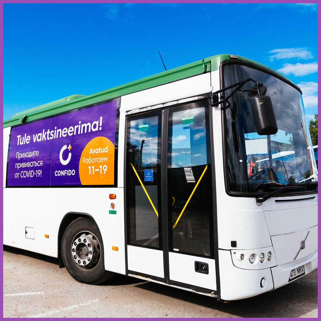Vaktsineerimisi viivad Moderna vaktsiiniga läbi Confido meedikud keskuse ees vaktsiinibussis.